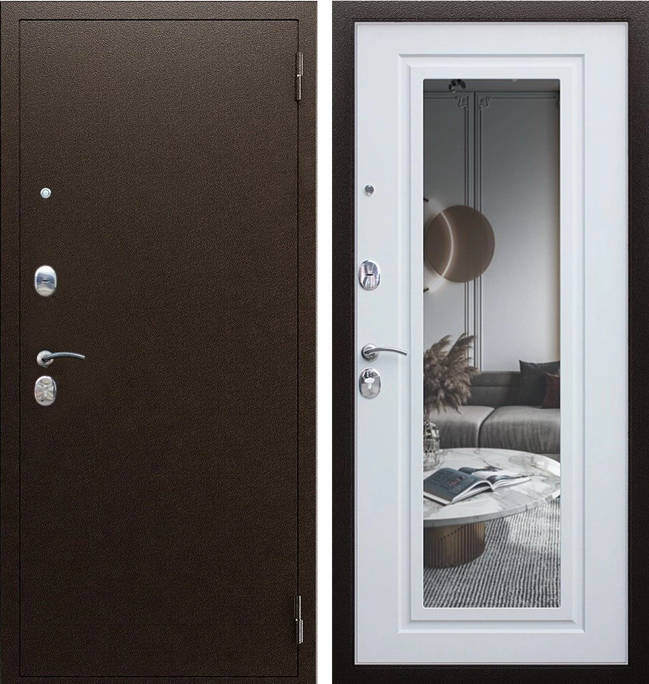 Надежная входная Дверь Комфорт с зеркалом премиум класса по цене 30 800 руб. Большая толщина стали защитит от проникновения в ваш дом, квартиру или коттедж. Используется очень качественная фурнитура: замки, цилиндры, ручки, защелки. Покрытие и отделка двери изготовлено под внимательным контролем производителя. Дверь имеет долгий срок службы и гарантию.